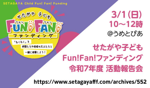 また、せたがや子どもFun!Fan!ファンディングの子どもたちの活動を地域社会に広く発信することで、今と未来をつくるパートナーである子どもと大人が対話しながら、地域が子どもを支え、子どもが地域を豊かにし、世田谷区子どもの権利条例に基づく誰もがつながり支え合う地域づくりに取り組みます。