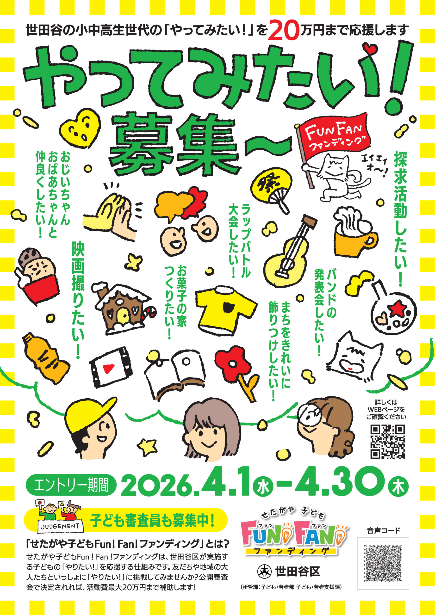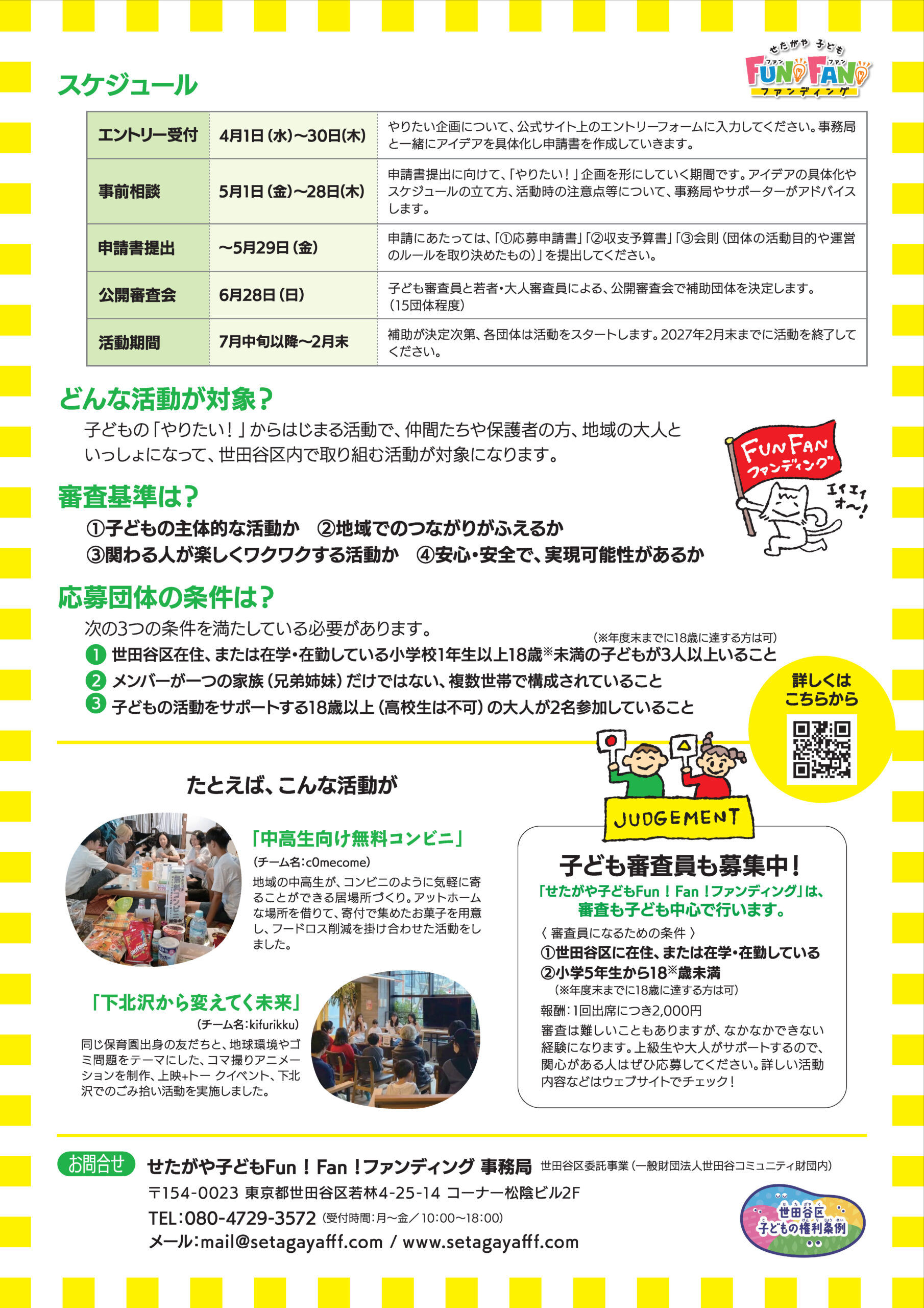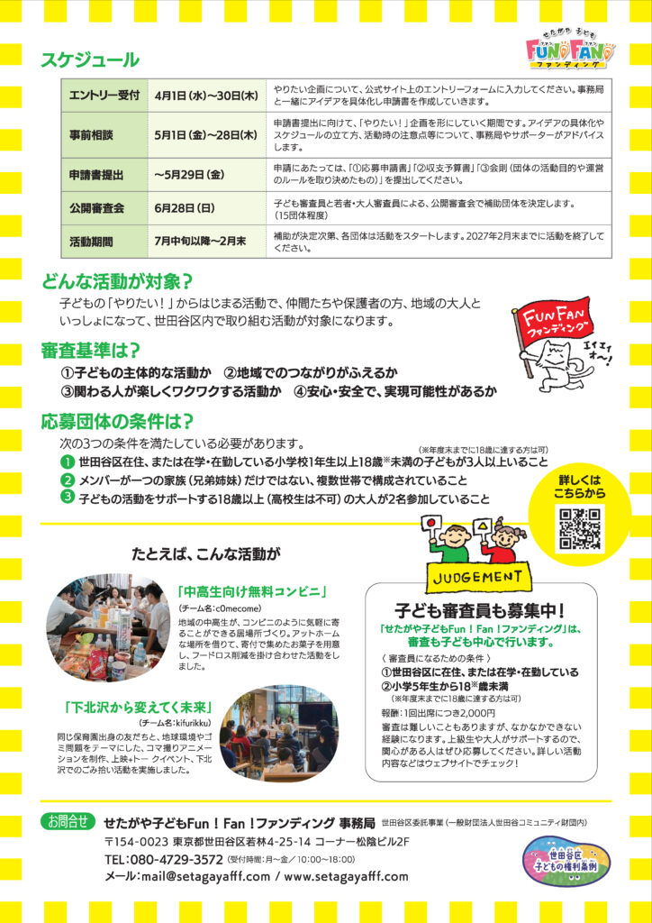 また、せたがや子どもFun!Fan!ファンディングの子どもたちの活動を地域社会に広く発信することで、世田谷区子どもの権利条例に基づく誰もがつながり支え合う地域づくりに取り組みます。