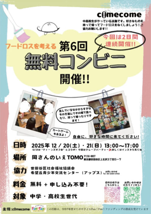 フードロスを考えることを目的とした中高生の居場所づくりのイベントです。レトルト食品、お菓子などいろいろあります。ボードゲームなども用意しています。1人でも、誰か誘ってでも、 気軽に来てください。いつ来て、いつ帰っても大丈夫です。