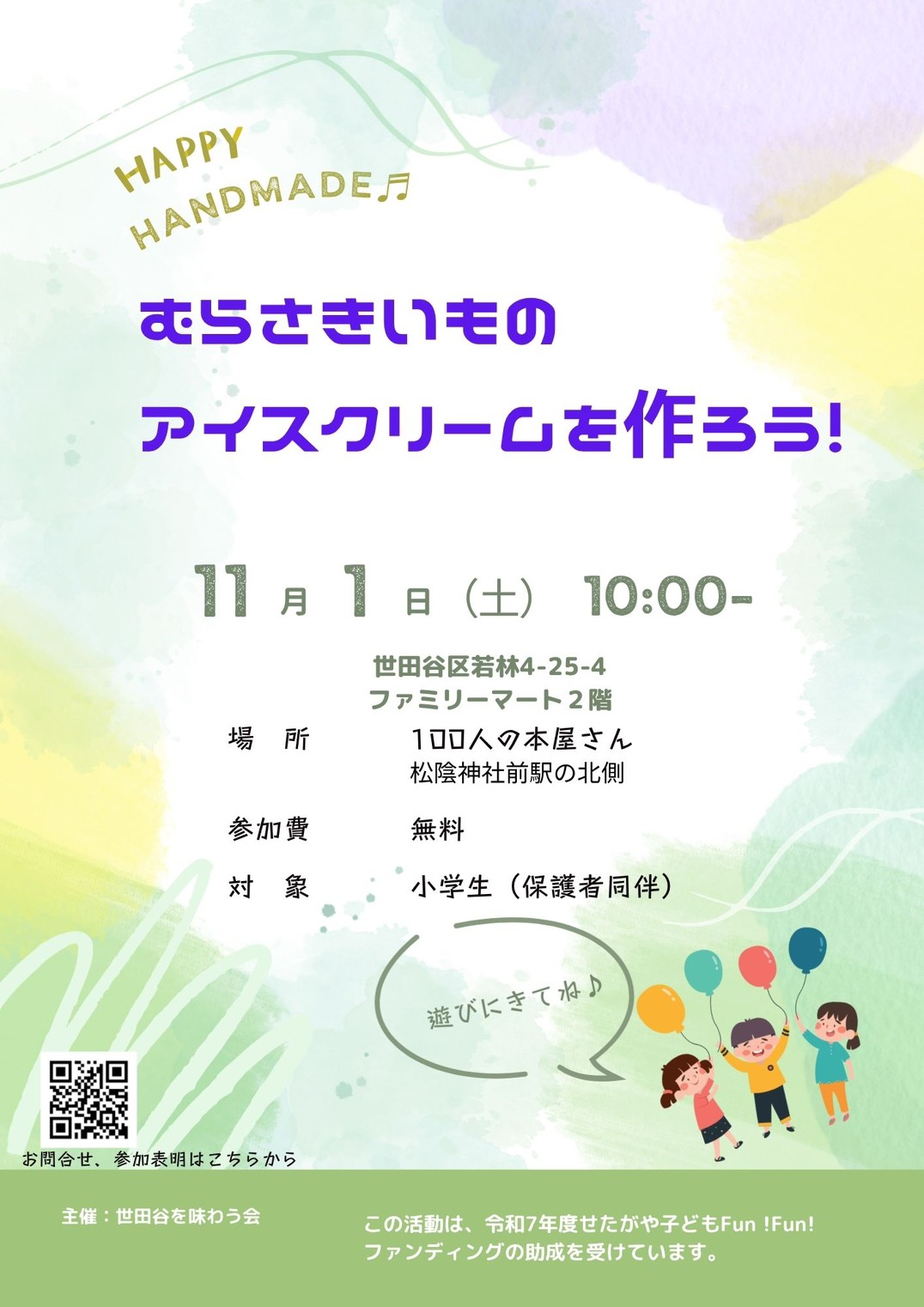 お知らせ2025.10.31【採択団体イベント】むらさきいものアイスクリームを作ろう!(11/1) (主催:世田谷を味わう会)遊びにきてね♪ …》チラシはこちら ■日時:11月1日(日) 10:00- ■会場:松陰神社前駅前100人の本屋さん世田谷区若林4-25-4 ファミリーマート2階 ■対象:小学生(保護者同伴) ■参加費:無料