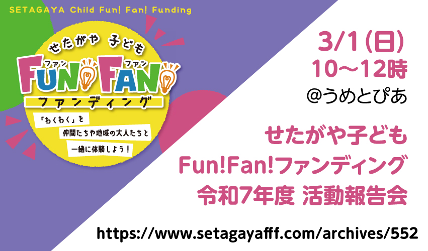 令和7年度「せたがや子どもFun!Fan!ファンディング」の助成を受けて活動した子どもたちが、一年間の活動成果を発表する活動報告会を開催します。 当日は、令和7年度採択団体による成果報告の後、採択団体に対する表彰や講評を行います。 どなたでも自由にご覧いただけますので、ぜひご来場いただき、子どもたちの取り組みを応援してください!
